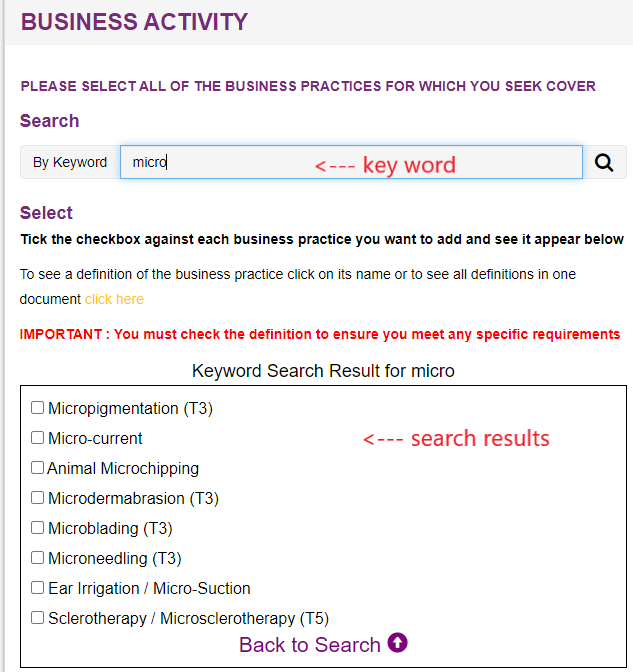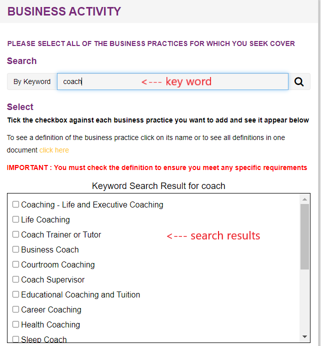 Select the Business Practices you seek cover for. The list of services we cover is lengthy and we list each service separately. A full list can be found on THIS link.